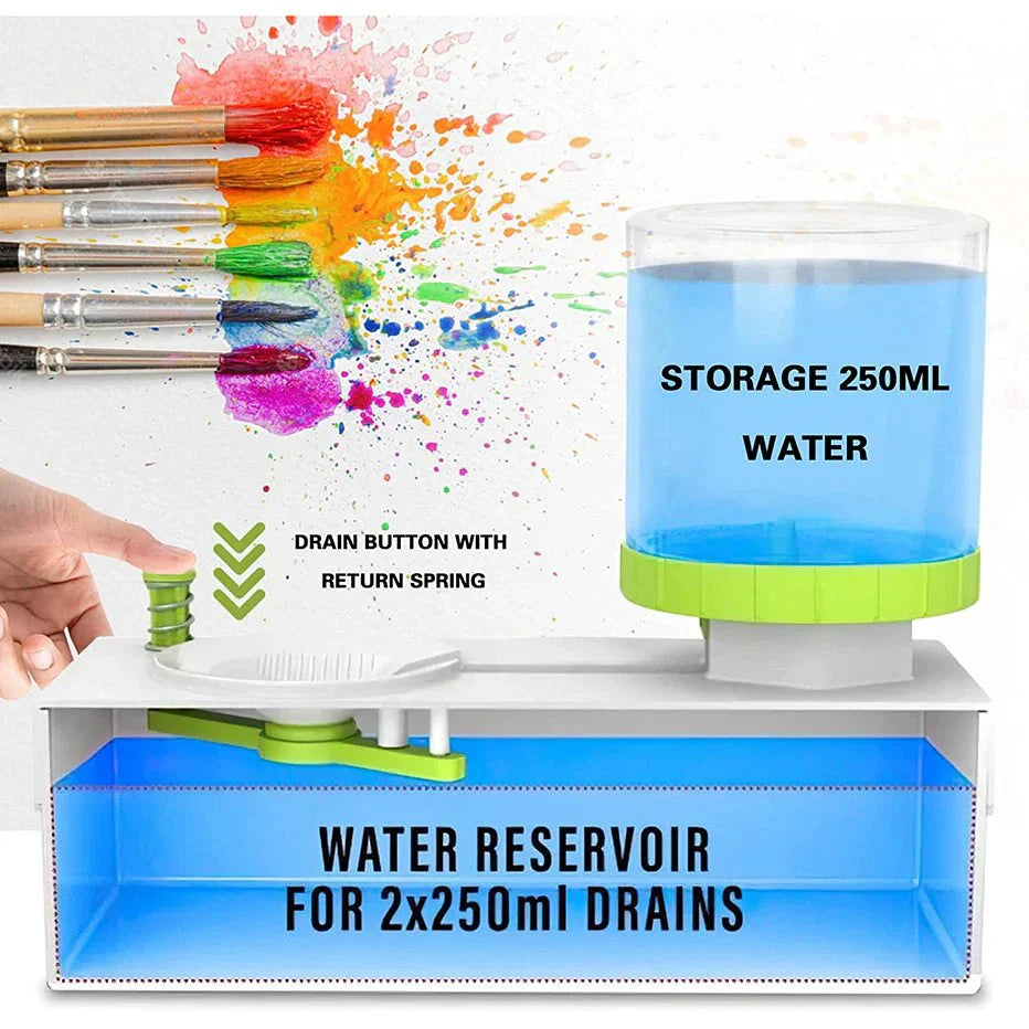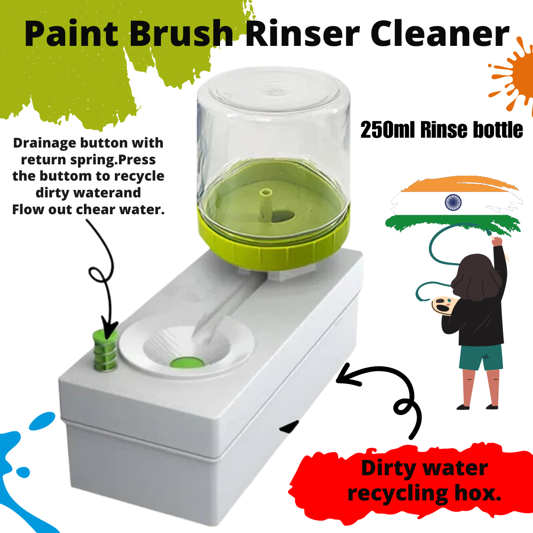 Experience hassle-free paintbrush cleaning with our Paint Brush Cleaner that effortlessly rinses away paint. Say goodbye to color-mixing mishaps and messy spills. The paintbrush rinser tool comes with a 250 ml bottle that allows you to flush around 30 times, you can replace dirty water with clean water just by pressing a button, the paintbrush cleaner allows you to focus more on painting. The water reservoir under the rinser has a capacity of 250ml before cleaning and emptying the dirty water (with drainage outlet). It only requires a small amount of water to clean the brush, effectively saving water resources.