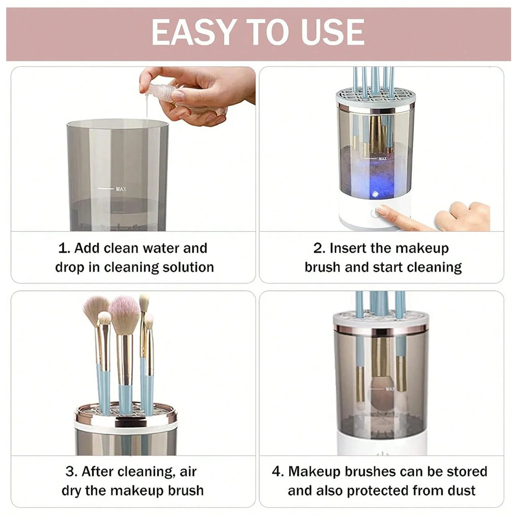 Say goodbye to tedious manual cleaning methods that risk damaging your brush bristles. With our Multipurpose Make Up Brush Cleaner, you can trust that your brushes are in safe hands.